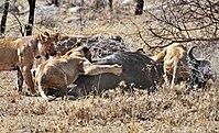 Although adult lions have no natural predators, evidence suggests most die violently from attacks by humans or other lions.[155] Lions often inflict serious injuries on members of other prides they encounter in territorial disputes or members of the home pride when fighting at a kill.[156] Crippled lions and cubs may fall victim to hyenas and leopards or be trampled by buffalo or elephants. Careless lions may be maimed when hunting prey.[157]