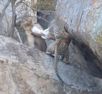Lions tend to dominate cheetahs and leopards, steal their kills and kill their cubs and even adults when given the chance.[129] Cheetahs in particular often lose their kills to lions or other predators.[130] A study in the Serengeti ecosystem revealed that lions killed at least 17 of 125 cheetah cubs born between 1987 and 1990.[131] Cheetahs avoid their competitors by using different temporal and habitat niches.[132] Leopards are able to take refuge in trees; lionesses, however, occasionally attempt to retrieve leopard kills from trees.[133] Lions similarly dominate African wild dogs, taking their kills and preying on young and rarely adult dogs. Population densities of wild dogs are low in areas where lions are more abundant.[134] However, there are a few reported cases of old and wounded lions falling prey to wild dogs.[135][136] Lions also charge at Nile crocodiles; depending on the size of the crocodile and the lion, either animal can lose their kills to the other. Lions have been observed killing crocodiles that ventured onto land.[137] Crocodiles may also kill and eat lions, evidenced by the occasional lion claw found in crocodile stomachs.[138]