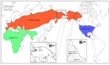 Phylogenetic analyses of nuclear and mitochondrial DNA from all Felidae species indicate that their evolutionary radiation began in Asia in the Miocene around 14.45 to 8.38 million years ago to 16.76 to 6.46 million years ago. The Panthera lineage is estimated to have genetically diverged from the common ancestor of the Felidae around 9.32 to 4.47 million years ago to 11.75 to 0.97 million years ago.[9][35][36] The geographic origin of the Panthera is most likely northern Central Asia.[37] Results of analyses differ in the phylogenetic relationship of the lion; it was thought to form a sister group with the jaguar (P. onca) that diverged 3.46 to 1.22 million years ago,[9] but also with the leopard (P. pardus) that diverged 3.1 to 1.95 million years ago[11][12] to 4.32 to 0.02 million years ago. Hybridisation between lion and snow leopard (P. uncia) ancestors possibly continued until about 2.1 million years ago.[36] The lion-leopard clade was distributed in the Asian and African Palearctic since at least the early Pliocene.[37] The earliest fossils recognisable as lions were found at Olduvai Gorge in Tanzania and are estimated to be up to 2 million years old.[35]