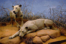 In Africa, the range of the lion originally spanned most of the central rainforest zone and the Sahara desert.[74] In the 1960s, it became extinct in North Africa, except in the southern part of Sudan.[75][76][77]