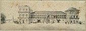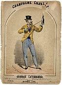 This very early colour lithograph from 1835 uses large washes of orange and cyan with black ink providing the details.
