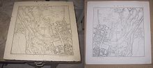 Lithography stone and mirror image print of a map of Munich