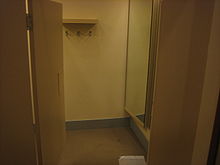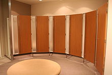 Separate changing rooms may be provided for men and women, or there may be a non-gender-specific open space with individual cubicles or stalls,[1] as with unisex public toilets. Many changing rooms include toilets, sinks and showers. Sometimes a changing room exists as a small portion of a restroom/washroom. For example, the men's and women's washrooms in Toronto's Dundas Square (which includes a water play area) each include a change area which is a blank counter space at the end of a row of sinks. In this case, the facility is primarily a washroom, and its use as a changing room is minimal, since only a small percentage of users change into bathing suits. Sometimes a person may change his or her clothes in a toilet cubicle of a washroom.