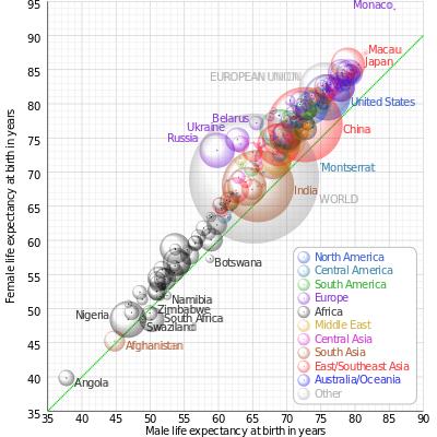 Various factors contribute to an individual's longevity. Significant factors in life expectancy include gender, genetics, access to health care, hygiene, diet and nutrition, exercise, lifestyle, and crime rates. Below is a list of life expectancies in different types of countries:[1]