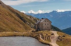 Low-rise house Alte Pforzheimer Hütte near the Pforzheimer See, in the Trentino-Alto Adige region of Northern Italy near the border to Switzerland