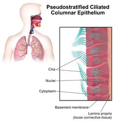 The respiratory tract is covered in epithelium, which varies down the tract. There are glands and mucus produced by goblet cells in parts, as well as smooth muscle, elastin or cartilage. Most of the epithelium (from the nose to the bronchi) is covered in ciliated pseudostratified columnar epithelium, commonly called respiratory epithelium.[13] The cilia beat in one direction, moving mucus towards the throat where it is swallowed. Moving down the bronchioles, the cells get more cuboidal in shape but are still ciliated.