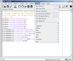 Another programmers' text editor, Vim (a descendant of vi), also has full implementation of macros. It can record into a register (macro) what a person types on the keyboard and it can be replayed or edited just like VBA macros for Microsoft Office. Vim also has a scripting language called Vimscript[5] to create macros.