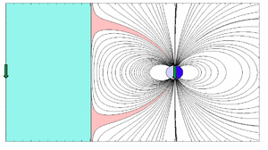 Prior to the age of space exploration, interplanetary space was considered to be a vacuum. The coincidence of the Carrington super flare and the super geomagnetic event of 1859 was evidence that plasma was ejected from the Sun during a flare event. Chapman and Ferraro [2][3][4][5] proposed that a plasma was emitted by the Sun in a burst as part of a flare event which disturbed the planet's magnetic field in a manner known as a geomagnetic storm. The collision frequency of particles in the plasma in the interplanetary medium is very low and the electrical conductivity is so high that it could be approximated to an infinite conductor. A magnetic field in a vacuum cannot penetrate a volume with infinite conductivity. Chapman and Bartels (1940)[1] illustrated this concept by postulating a plate with infinite conductivity placed on the dayside of a planet's dipole as shown in the schematic. The field lines on the dayside are bent. At low latitudes, the magnetic field lines are pushed inward. At high latitudes, the magnetic field lines are pushed backwards and over the polar regions. The boundary between the region dominated by the planet's magnetic field (i.e., the magnetosphere) and the plasma in the interplanetary medium is the magnetopause. The configuration equivalent to a flat, infinitely conductive plate is achieved by placing an image dipole (green arrow at left of schematic) at twice the distance from the planet's dipole to the magnetopause along the planet-Sun line. Since the solar wind is continuously flowing outward, the magnetopause above, below and to the sides of the planet are swept backward into the geomagnetic tail as shown in the artist's concept. The region (shown in pink in the schematic) which separates field lines from the planet which are pushed inward from those which are pushed backward over the poles is an area of weak magnetic field or day-side cusp. Solar wind particles can enter the planet's magnetosphere through the cusp region. Because the solar wind exists at all times and not just times of solar flares, the magnetopause is a permanent feature of the space near any planet with a magnetic field.