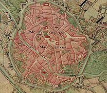 - 1775 Mechelen city plan (in French) engraving by Berlin with c.1777 (in Dutch) legend (map info)