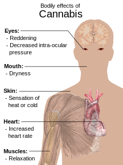 Cannabis has various mental and physical effects, which include euphoria, altered states of mind and sense of time, difficulty concentrating, impaired short-term memory and body movement,[24] relaxation,[25] and an increase in appetite.[26] Onset of effects is felt within minutes when smoked, and about 30 to 60 minutes when cooked and eaten.[24][27] The effects last for two to six hours, depending on the amount used.[27] At high doses, mental effects can include anxiety, delusions (including ideas of reference), hallucinations, panic, paranoia, and psychosis.[24][23] There is a strong relation between cannabis use and the risk of psychosis,[28][29] though the direction of causality is debated.[30] Physical effects include increased heart rate, difficulty breathing, nausea, and behavioral problems in children whose mothers used cannabis during pregnancy;[24] short-term side effects may also include dry mouth and red eyes.[31][32] Long-term adverse effects may include addiction, decreased mental ability in those who started regular use as adolescents, chronic coughing, and susceptibility to respiratory infections.[33]