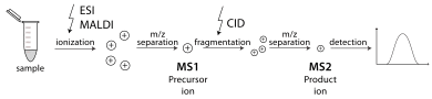 In a typical MS procedure, a sample, which may be solid, liquid, or gaseous, is ionized, for example by bombarding it with electrons. This may cause some of the sample's molecules to break into charged fragments or simply become charged without fragmenting. These ions are then separated according to their mass-to-charge ratio, for example by accelerating them and subjecting them to an electric or magnetic field: ions of the same mass-to-charge ratio will undergo the same amount of deflection.[1] The ions are detected by a mechanism capable of detecting charged particles, such as an electron multiplier. Results are displayed as spectra of the signal intensity of detected ions as a function of the mass-to-charge ratio. The atoms or molecules in the sample can be identified by correlating known masses (e.g. an entire molecule) to the identified masses or through a characteristic fragmentation pattern.