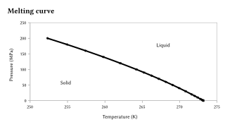 The melting point is sensitive to extremely large changes in pressure, but generally this sensitivity is orders of magnitude less than that for the boiling point, because the solid-liquid transition represents only a small change in volume.[10][11] If, as observed in most cases, a substance is more dense in the solid than in the liquid state, the melting point will increase with increases in pressure. Otherwise the reverse behavior occurs. Notably, this is the case of water, as illustrated graphically to the right, but also of Si, Ge, Ga, Bi. With extremely large changes in pressure, substantial changes to the melting point are observed. For example, the melting point of silicon at ambient pressure (0.1 MPa) is 1415 °C, but at pressures in excess of 10 GPa it decreases to 1000 °C.[12]