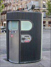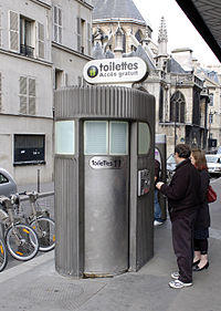Many public toilets are permanent small buildings visible to passers-by on the street. Others are underground, including older facilities in Britain and Canada. Contemporary street toilets include automatic, self-cleaning toilets in self-contained pods; an example is the Sanisette, which first became popular in France.[5] An Indian version of these automated toilet pods, remotely monitored by sensors, are the Electronic Public Toilets or eToilets; they have proliferated across the country since 2014, as part of Swachh Bharat Abhiyan, the campaign launched that year to end open defecation.[6]