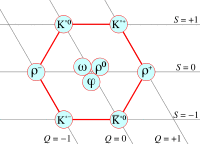 , corresponded to the isospin projections I3 = +1, I3 = 0, and I3 = −1 respectively. Another example is the "rho particle", also with three charged states. Its "charged states"