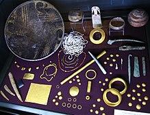 The Varna Necropolis, Bulgaria, is a burial site in the western industrial zone of Varna (approximately 4 km from the city centre), internationally considered one of the key archaeological sites in world prehistory. The oldest gold treasure in the world, dating from 4,600 BC to 4,200 BC, was discovered at the site.[14] The gold piece dating from 4,500 BC, recently founded in Durankulak, near Varna is another important example.[15][16] Other signs of early metals are found from the third millennium BC in places like Palmela (Portugal), Los Millares (Spain), and Stonehenge (United Kingdom). However, the ultimate beginnings cannot be clearly ascertained and new discoveries are both continuous and ongoing.
