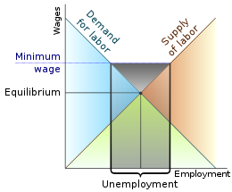 A firm's cost is an increasing function of the wage rate. The higher the wage rate, the fewer hours an employer will demand of employees. This is because, as the wage rate rises, it becomes more expensive for firms to hire workers and so firms hire fewer workers (or hire them for fewer hours). The demand of labor curve is therefore shown as a line moving down and to the right.[40] Since higher wages increase the quantity supplied, the supply of labor curve is upward sloping, and is shown as a line moving up and to the right.[40] If no minimum wage is in place, wages will adjust until quantity of labor demanded is equal to quantity supplied, reaching equilibrium, where the supply and demand curves intersect. Minimum wage behaves as a classical price floor on labor. Standard theory says that, if set above the equilibrium price, more labor will be willing to be provided by workers than will be demanded by employers, creating a surplus of labor, i.e. unemployment.[40] The economic model of markets predicts the same of other commodities (like milk and wheat, for example): Artificially raising the price of the commodity tends to cause an increase in quantity supplied and a decrease in quantity demanded. The result is a surplus of the commodity. When there is a wheat surplus, the government buys it. Since the government does not hire surplus labor, the labor surplus takes the form of unemployment, which tends to be higher with minimum wage laws than without them.[31]