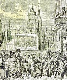 Miracle plays, or Saint's plays, are now distinguished from mystery plays as they specifically re-enacted miraculous interventions by the saints, particularly St. Nicholas or St. Mary, into the lives of ordinary people, rather than biblical events;[16] however both of these terms are more commonly used by modern scholars than they were by medieval people, who used a wide variety of terminology to refer to their dramatic performances. Robert Chambers, writing in the 19th century, notes that "especially in England, miracle [came] to stand for religious play in general".[17]