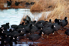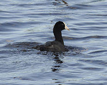 The American coot (Fulica americana), also known as a mud hen or pouldeau, is a bird of the family Rallidae. Though commonly mistaken for ducks, American coots are only distantly related to ducks, belonging to a separate order. Unlike the webbed feet of ducks, coots have broad, lobed scales on their lower legs and toes that fold back with each step in order to facilitate walking on dry land.[2] Coots live near water, typically inhabiting wetlands and open water bodies in North America. Groups of coots are called covers or rafts. The oldest known coot lived to be 22 years old.[2]