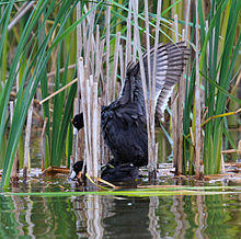 The coot mating season occurs during May and June.[22] Coot mate pairings are monogamous throughout their life, given they have a suitable territory. A typical reproductive cycle involves multiple stages: pairing, nesting, copulation, egg deposition, incubation, and hatching.[23] The American coot typically has long courtship periods. This courtship period is characterized by billing, bowing, and nibbling. Males generally initiate billing, which is the touching of bills between individuals. As the pair bond becomes more evident, both males and females will initiate billing only with each other and not other males or females. After a pair bond is cemented, the mating pair looks for a territory to build a nest in. A pair bond becomes permanent when a nesting territory is secured. Copulation behavior among coot pairs always falls under the same general pattern.[23] First the male chases the female. Then, the female moves to the display platform and squats with her head under the water. The male then mounts the female, using his claws and wings to balance on the female's back while the she brings her head above the water. Sexual intercourse usually takes no longer than two seconds.[23]