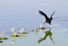 The American coot is a migratory bird that occupies most of North America. It lives in the Pacific and southwestern United States and Mexico year-round and occupies more northeastern regions during the summer breeding season. In the winter they can be found as far south as Panama.[2] Coots generally build floating nests and lay 8–12 eggs per clutch.[2] Females and males have similar appearances, but they can be distinguished during aggressive displays by the larger ruff (head plumage) on the male.[3] American coots eat primarily algae and other aquatic plants but also animals (both vertebrates and invertebrates) when available.[4]