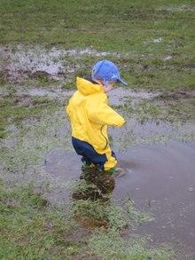 Puddles are a source of recreation for children, who often like jumping in puddles as an "up-side" to rain.[4][5][6][7] A children's nursery rhyme records the story of Doctor Foster and his encounter with a puddle in Gloucester. Muddy puddles, and the pleasures of splashing mud in them, are a repeated theme in the children's animation Peppa Pig, to the extent of selling character-branded wellington boots.