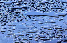 A puddle is a small accumulation of liquid, usually water, on a surface.[1] It can form either by pooling in a depression on the surface, or by surface tension upon a flat surface.