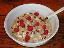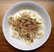 Muesli (/ˈmjuːzli/ MEWZ-lee;[1][2] in English sometimes museli[3][4] is a cold oatmeal dish based on rolled oats and ingredients like grains, nuts, seeds and fresh or dried fruits. This mix may be combined with one or more liquids like water, milk, plant milks, yogurt, or fruit juice and left for a time to soften the oats before being consumed.[5]