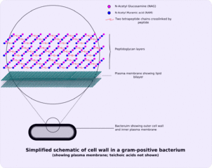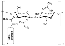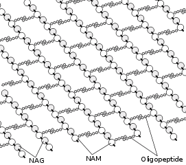 Peptidoglycan or murein is a polymer consisting of sugars and amino acids that forms a mesh-like layer outside the plasma membrane of most bacteria, forming the cell wall. The sugar component consists of alternating residues of β-(1,4) linked N-acetylglucosamine (NAG) and N-acetylmuramic acid (NAM). Attached to the N-acetylmuramic acid is a peptide chain of three to five amino acids. The peptide chain can be cross-linked to the peptide chain of another strand forming the 3D mesh-like layer.[1] Peptidoglycan serves a structural role in the bacterial cell wall, giving structural strength, as well as counteracting the osmotic pressure of the cytoplasm. Peptidoglycan is also involved in binary fission during bacterial cell reproduction.