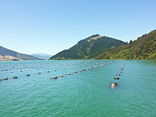 - Longline culture (rope culture): Mussels are cultivated extensively in New Zealand, where the most common method is to attach mussels to ropes which are hung from a rope back-bone supported by large plastic floats. The most common species cultivated in New Zealand is the New Zealand green-lipped mussel. Longline culture is the most recent development for mussel culture[7] and are often used as an alternative to raft culture in areas that are more exposed to high wave energy. A long-line is suspended by a series of small anchored floats and ropes or socks of mussels are then suspended vertically from the line.