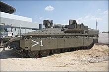The development did not progress much in the 1990s due to lack of funds, but following 2004 Israel–Gaza conflict, which exposed the vulnerability of the M113 armored personnel carrier to improvised explosive devices and rocket-propelled grenades, the IDF re-opened the development.[8] At that point the Stryker armored personnel carrier was offered and rejected by the IDF.[9]
