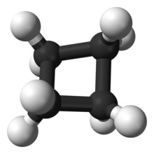Cyclobutane has the carbon atoms in a puckered square with approximately 90° bond angles; "puckering" reduces the eclipsing interactions between hydrogen atoms. Its ring strain is therefore slightly less, at around 110 kJ mol−1.