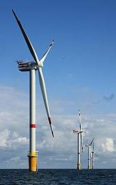 Wind is a natural resource that can be used to generate electricity, as with these 5 MW wind turbines in Thorntonbank Wind Farm 28 km (17 mi) off the coast of Belgium.