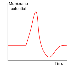 As the membrane potential is increased, sodium ion channels open, allowing the entry of sodium ions into the cell. This is followed by the opening of potassium ion channels that permit the exit of potassium ions from the cell. The inward flow of sodium ions increases the concentration of positively charged cations in the cell and causes depolarization, where the potential of the cell is higher than the cell's resting potential. The sodium channels close at the peak of the action potential, while potassium continues to leave the cell. The efflux of potassium ions decreases the membrane potential or hyperpolarizes the cell. For small voltage increases from rest, the potassium current exceeds the sodium current and the voltage returns to its normal resting value, typically −70 mV.[5][6][7] However, if the voltage increases past a critical threshold, typically 15 mV higher than the resting value, the sodium current dominates. This results in a runaway condition whereby the positive feedback from the sodium current activates even more sodium channels. Thus, the cell fires, producing an action potential.[5][8][9][note 1] The frequency at which a neuron elicits action potentials is often referred to as a firing rate or neural firing rate.