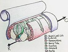 Neural crest was first described in the chick embryo by Wilhelm His Sr. in 1868 as "the cord in between" (Zwischenstrang) because of its origin between the neural plate and non-neural ectoderm.[1] He named the tissue ganglionic crest since its final destination was each lateral side of the neural tube where it differentiated into spinal ganglia.[6] During the first half of the 20th century the majority of research on neural crest was done using amphibian embryos which was reviewed by Hörstadius (1950) in a well known monograph.[7]
