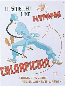 Chloropicrin is harmful to humans. It can be absorbed systemically through inhalation, ingestion, and the skin. At high concentrations it is severely irritating to the lungs, eyes, and skin.[22] In World War I German forces used concentrated chloropicrin against Allied forces as a tear gas. While not as lethal as other chemical weapons, it caused vomiting and forced Allied soldiers to remove their masks to vomit, exposing them to other, more toxic chemical gases used as weapons during the war.[23]