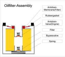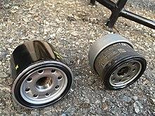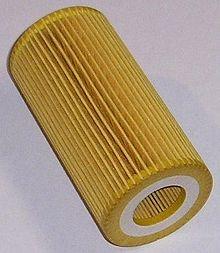 Early engine oil filters were of cartridge (or replaceable element) construction, in which a permanent housing contains a replaceable filter element or cartridge. The housing is mounted either directly on the engine or remotely with supply and return pipes connecting it to the engine. In the mid-1950s, the spin-on oil filter design was introduced: a self-contained housing and element assembly which was to be unscrewed from its mount, discarded, and replaced with a new one. This made filter changes more convenient and potentially less messy, and quickly came to be the dominant type of oil filter installed by the world's automakers. Conversion kits were offered for vehicles originally equipped with cartridge-type filters.[6] In the 1990s, European and Asian automakers in particular began to shift back in favor of replaceable-element filter construction, because it generates less waste with each filter change. American automakers have likewise begun to shift to replaceable-cartridge filters, and retrofit kits to convert from spin-on to cartridge-type filters are offered for popular applications.[7] Commercially available automotive oil filters vary in their design, materials, and construction details. Ones that are made from completely synthetic material excepting the metal drain cylinders contained within are far superior and longer lasting than the traditional cardboard/cellulose/paper type that still predominate. These variables affect the efficacy, durability, and cost of the filter.[8]