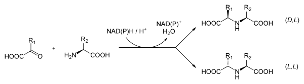 1. The vast majority are secondary amine derivatives resulting from the reduction of the imine formed by condensation of an amino acid, either with a keto acid or a sugar. The first subcategory includes the opines from the nopaline and octopine families. The nopaline family (nopaline, nopalinic acid, leucinopine, glutaminopine, succinamopine) is formed when alpha-ketoglutarate serves as the keto substrate in the condensation reaction. The octopine family (octopine, octopinic acid, lysopine, histopine) is formed when pyruvate is involved in the condensation reaction.