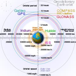 - Medium Earth orbit (MEO): Geocentric orbits ranging in altitude from 2,000 km (1,240 miles) to just below geosynchronous orbit at 35,786 kilometers (22,236 mi). Also known as an intermediate circular orbit. These are "most commonly at 20,200 kilometers (12,600 mi), or 20,650 kilometers (12,830 mi), with an orbital period of 12 hours."[16]