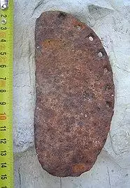 Working oxen usually require shoes,[6] although in England not all working oxen were shod.[7] Since their hooves are cloven, two shoes are required for each hoof, as opposed to a single horseshoe. Ox shoes are usually of approximately half-moon or banana shape, either with or without caulkins, and are fitted in symmetrical pairs to the hooves. Unlike horses, oxen are not easily able to balance on three legs while a farrier shoes the fourth.[6][8] In England, shoeing was accomplished by throwing the ox to the ground and lashing all four feet to a heavy wooden tripod until the shoeing was complete.[6] A similar technique was used in Serbia[9] and, in a simpler form, in India,[10] where it is still practiced.[11] In Italy, where oxen may be very large, shoeing is accomplished using a massive framework of beams in which the animal can be partly or completely lifted from the ground by slings passed under the body; the feet are then lashed to lateral beams or held with a rope while the shoes are fitted.[12][13]