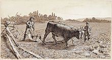 Oxen can pull heavier loads, and pull for a longer period of time than horses depending on weather conditions.[16] On the other hand, they are also slower than horses, which has both advantages and disadvantages; their pulling style is steadier, but they cannot cover as much ground in a given period of time. For agricultural purposes, oxen are more suitable for heavy tasks such as breaking sod or plowing in wet, heavy, or clay-filled soil. When hauling freight, oxen can move very heavy loads in a slow and steady fashion. They are at a disadvantage compared to horses when it is necessary to pull a plow or load of freight relatively quickly.