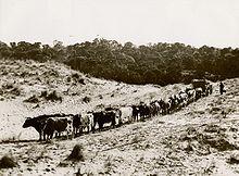A tradition in south eastern England was to use oxen (often Sussex cattle) as dual-purpose animals: for draft and beef. A plowing team of eight oxen normally consisted of four pairs aged a year apart. Each year, a pair of steers of about three years of age would be bought for the team and trained with the older animals. The pair would be kept for about four years, then sold at about seven years old to be fattened for beef – thus covering much of the cost of buying that year's new pair. Use of oxen for plowing survived in some areas of England (such as the South Downs) until the early twentieth century. Pairs of oxen were always hitched the same way round, and they were often given paired names. In southern England it was traditional to call the near-side (left) ox of a pair by a single-syllable name and the off-side (right) one by a longer one (for example: Lark and Linnet, Turk and Tiger).[3]