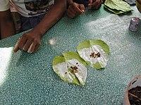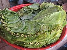 Paan (from Sanskrit: पर्ण, romanized: parṇá, lit. leaf,[1] cognate with English fern) is a preparation combining betel leaf with areca nut widely consumed throughout Southeast Asia, South Asia and East Asia (mainly Taiwan). It is chewed for its stimulant effects.[2] After chewing, it is either spat out or swallowed. Paan has many variations. Slaked lime (chuna) paste is commonly added to bind the leaves. Some preparations in the Indian subcontinent include katha paste or mukhwas to freshen the breath.