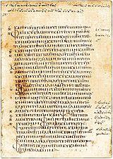 The uncial hand lingered on, mainly for liturgical manuscripts, where a large and easily legible script was serviceable, as late as the 12th century, but in ordinary use it had long been superseded by a new type of hand, the minuscule, which originated in the 8th century, as an adaptation to literary purposes of the second of the types of Byzantine cursive mentioned above. A first attempt at a calligraphic use of this hand, seen in one or two manuscripts of the 8th or early 9th century,[20] in which it slopes to the right and has a narrow, angular appearance, did not find favour, but by the end of the 9th century a more ornamental type, from which modern Greek script descended, was already established. It has been suggested that it was evolved in the Monastery of Stoudios at Constantinople.[21] In its earliest examples it is upright and exact but lacks flexibility; accents are small, breathings square in formation, and in general only such ligatures are used as involve no change in the shape of letters. The single forms have a general resemblance (with considerable differences in detail) both to the minuscule cursive of late papyri, and to those used in modern Greek type; uncial forms were avoided.