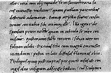 Of the many books written in square capitals, the éditions de luxe of ancient times, only a few fragments have survived, the most famous being pages from manuscripts of Virgil.[32] The finest examples of rustic capitals, the use of which is attested by papyri of the 1st century,[33] are to be found in manuscripts of Virgil[34] and Terence.[35] Neither of these forms of capital writing offers any difficulty in reading, except that no space is left between the words. Their dates are still uncertain, in spite of attempts to determine them by minute observation.[36]