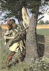 The term pandur made its way into military use via a Hungarian loanword, in turn originating from the Croatian term pudar, though the nasal in place of the "u" suggests a borrowing before Croatian innovated its own reflex for Proto-Slavic /ɔ̃/. "Pudar" is still applied to security guards protecting crops in vineyards and fields, and it was coined from the verb puditi (also spelled pudati) meaning to chase or scare away. The meaning of the Hungarian loanword was expanded to guards in general, including law enforcement officers.[1] The word was likely ultimately derived from medieval Latin banderius or bannerius, meaning either a guardian of fields or summoner,[2] or follower of a banner.[3]