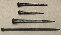 Nails were sometimes inscribed with incantations or signs intended for religious or mystical benefit, used at shrines or on the doors of houses for protection.[23]