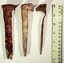 The first nails were made of wrought iron. Nails date back at least to Ancient Egypt—bronze nails found in Egypt have been dated 3400 BC.[2][3] The Bible provides a number of references to nails, including the story in Judges of Jael the wife of Heber, who drives a nail (or tent-peg) into the temple of a sleeping Canaanite commander;[4] the provision of iron for nails by King David for what would become Solomon's Temple;[5] and in connection with the crucifixion of Christ.