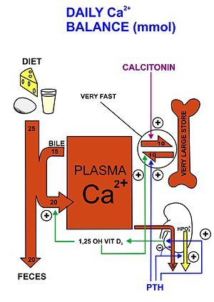 A diagrammatic representation of the movements of calcium ions into and out of the blood plasma (the central square labeled PLASMA Ca2+) in an adult in calcium balance: The widths of the red arrows indicating movement into and out of the plasma are roughly in proportion to the daily amounts of calcium moved in the indicated directions. The size of the central square in not in proportion to the size of the diagrammatic bone, which represents the calcium present in the skeleton, and contains about 25,000 mmol (or 1 kg) of calcium compared to the 9 mmol (360 mg) dissolved in the blood plasma. The differently colored narrow arrows indicate where the specified hormones act, and their effects (“+” means stimulates; “-“ means inhibits) when their plasma levels are high. PTH is parathyroid hormone, 1,25 OH VIT D3 is calcitriol or 1,25 dihydroxyvitamin D3, and CALCITONIN is a hormone secreted by the thyroid gland when the plasma ionized calcium level is high or rising. The diagram does not show the extremely small amounts of calcium that move into and out of the cells of the body, nor does it indicate the calcium that is bound to the extracellular proteins (in particular the plasma proteins) or to plasma phosphate.[11][12][13][14][15]
