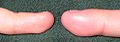 Left and right ring fingers of the same individual. The distal phalanx of the finger on the right exhibits swelling due to acute paronychia