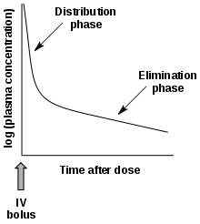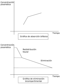 • Multiphasic absorption: Drugs injected intravenously are removed from the plasma through two primary mechanisms: (1) Distribution to body tissues and (2) metabolism + excretion of the drugs. The resulting decrease of the drug's plasma concentration follows a biphasic pattern (see figure).